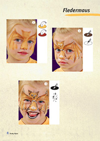 Anstatt viele Worte zu verlieren, können Sie anhand der Pinsel- und Schwämmchenfarbe neben der Abbildung ganz leicht die einzelnen Schminkschritte nachvollziehen.